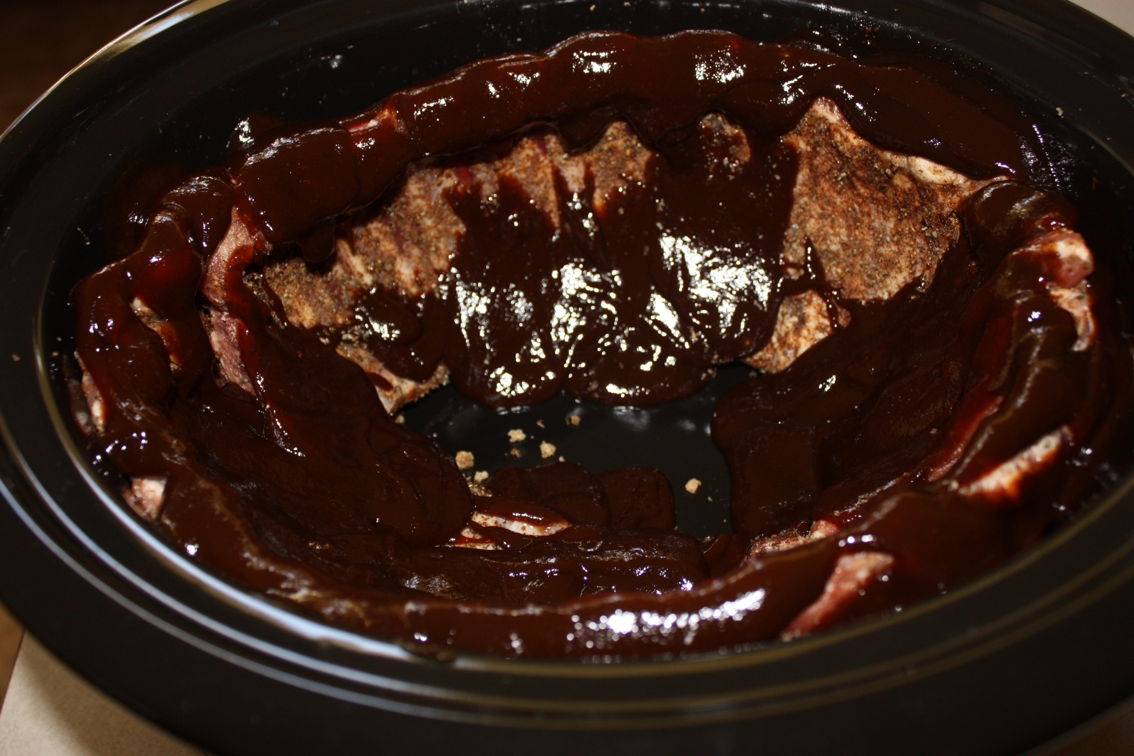 Now all you need to do is place the lid on your pot set the crockpot to low and walk away for 6-7 hrs or until the internal temperature is 179 degrees. Avoid opening the lid for the first 5 hrs, because the crockpot will have to regain the loss of heat and that can cause the food to take longer to cook. If your crockpot tends to cook on the high side this could be done closer to 5 hrs. I know mine runs high and it would have been done at 6 but I let it cook for 7. It still maintained all the flavors and was not dried out but it was running closer to 206 degrees internally instead of the recommended temp of 179.